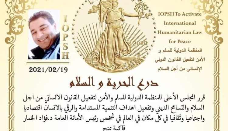 المنظمة الدولية للسلم والأمن لتفعيل القانون الدولي الإنساني تمنح الأمين العام للحزب درع الحرية والسلام