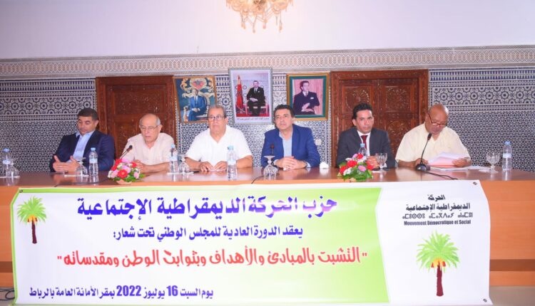 عقد أعضاء المجلس الوطني للحركة الديمقراطية الاجتماعي. يوم السبت 16 يوليوز 2022،اجتماعا في دورته العادية بمقر الحزب تحت شعار ” التشبث بالمبادئ والاهداف وبثوابت الوطن ومقدساته” ،برئاسة الأمين العام للحزب،الأخ عبد الصمد عرشان ،قصد مناقشة القضايا التنظيمية والاقتراحات المعروضة عليه من طرف المكتب السياسي ،والتداول في النقط المحددة في جدول الاعمال،المتمثلة في الموافقة على تحديد تاريخ انعقاد المؤتمر الوطني الخامس للحزب،ومكان انعقاده،وانتخاب اللجنة التحضيرية ورئيسها،وكذا الاتفاق على تواريخ انعقاد مؤتمرات المنظمات الموازية لاعادة هيكلتها وتجديد مكاتبها.